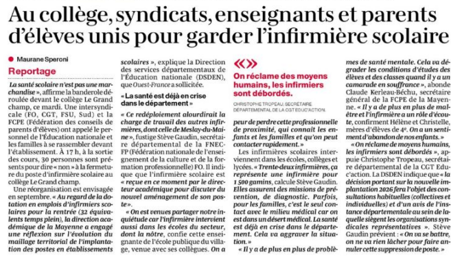 Mayenne : Intersyndicale et parents unis pour garder leur INFENES 30 janvier 2026 snfoien Académies, Actualité, Nantes https://www.hautanjou.fr/actualite-20598-sante-un-poste-d-infirmiere-scolaire-supprime-a-grez-en-bouere-fo-alerte-sur-le-risque-pour-les-eleves